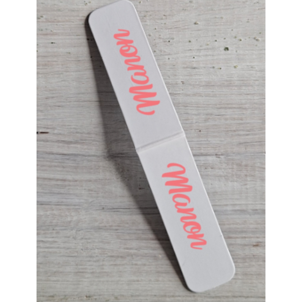 Een gepersonaliseerde magnetische boekenlegger bedrukt met naam.