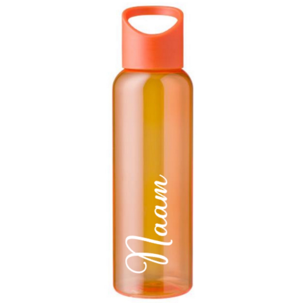 Kunststof drinkfles in de kleur oranje met een inhoud van 500 ml. Deze waterfles is van transparant kunststof en bevat een draaidop in de kleur van de fles. In de dop is een handige draaglus verwerkt. Een toffe drinkfles bedrukt met eigen naam, bedrijfsnaam of andere leuke tekst. Heel handig voor op school, werk of tijdens het sporten.