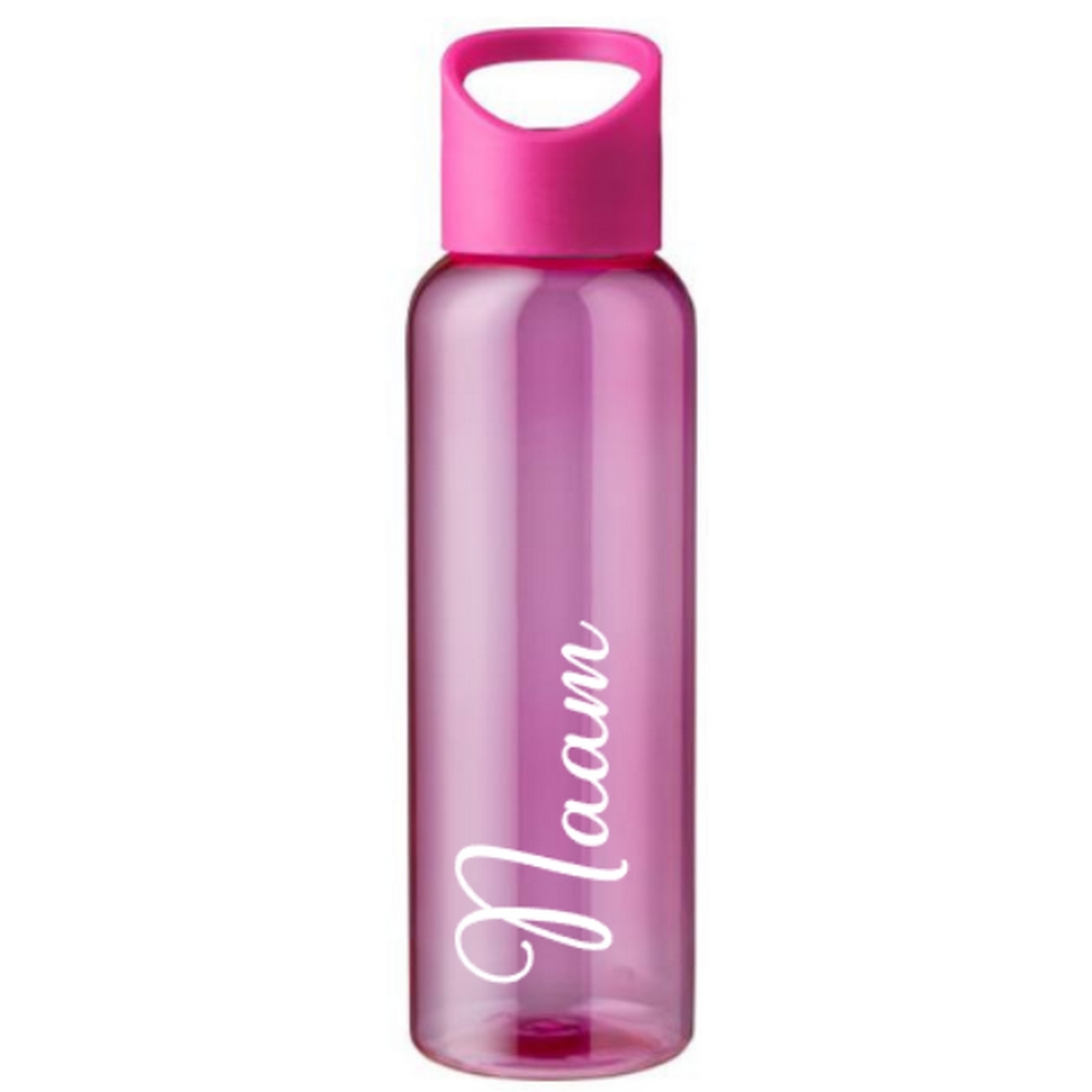Kunststof drinkfles in de kleur roze met een inhoud van 500 ml. Deze waterfles is van transparant kunststof en bevat een draaidop in de kleur van de fles. In de dop is een handige draaglus verwerkt. Een toffe drinkfles bedrukt met eigen naam, bedrijfsnaam of andere leuke tekst. Heel handig voor op school, werk of tijdens het sporten.