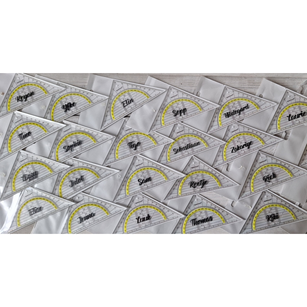 Een gepersonaliseerde geodriehoek bedrukt met naam. Nooit meer de vraag van wie deze geodriehoek is? Leuk als afscheidscadeau van de basisschool. Handig voor op het middelbaar onderwijs.