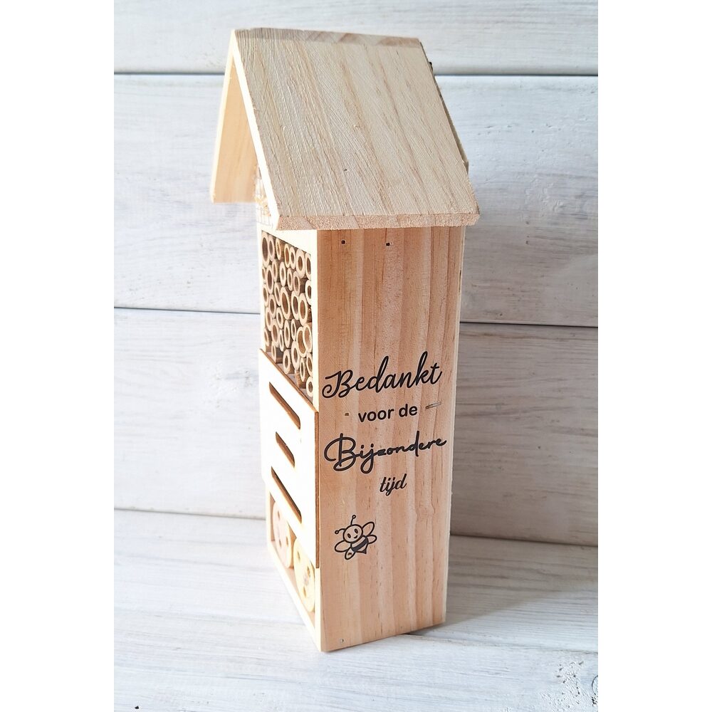 Dit insectenhotel bedrukt met de tekst:’Bedankt voor de Bijzondere tijd’, is de perfecte accommodatie voor alle kleine insecten in de tuin. De afmeting is 13x8x26cm en het insectenhotel is gemaakt van FSC hout.