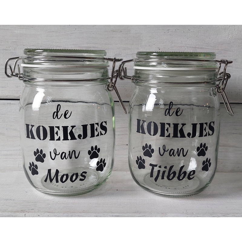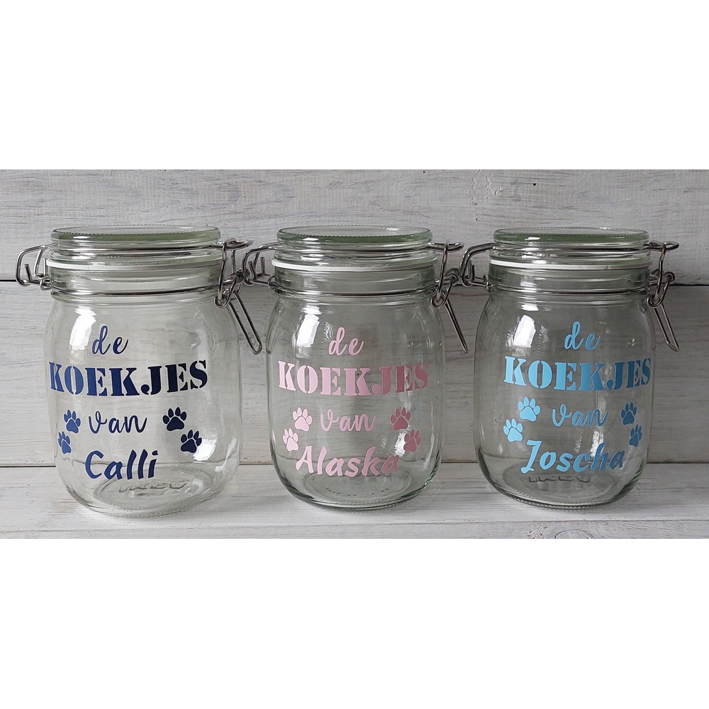 Een weckpot/koekjespot bedrukt met de naam van uw hond of kat. Helemaal speciaal gepersonaliseerd voor uw huisdier.