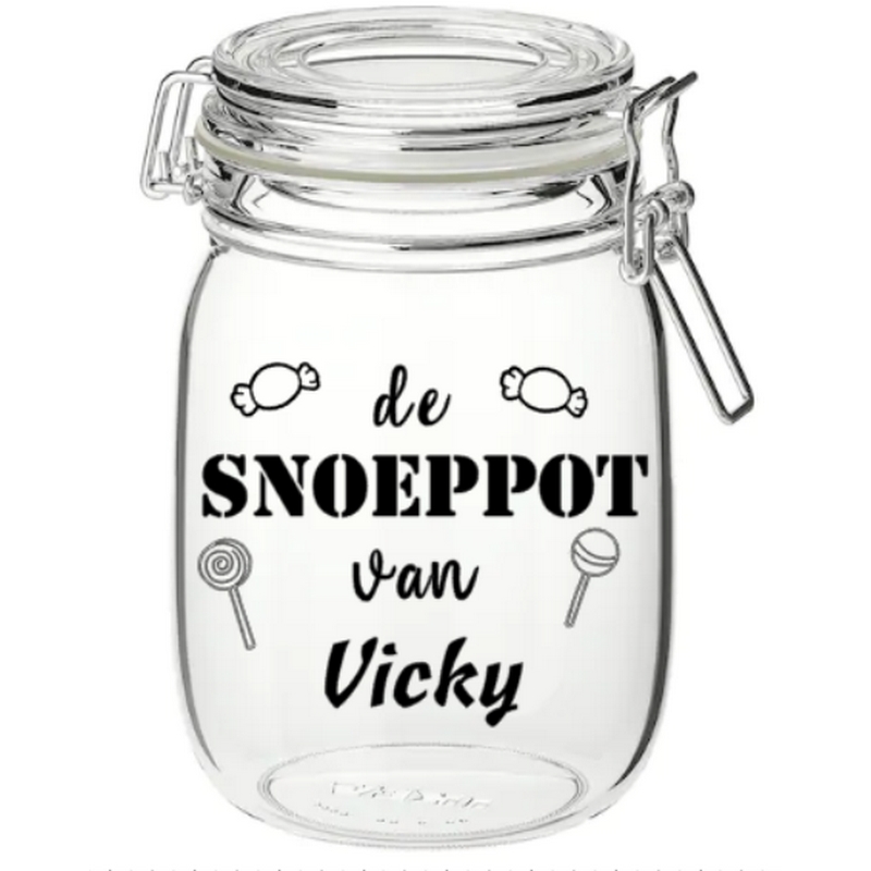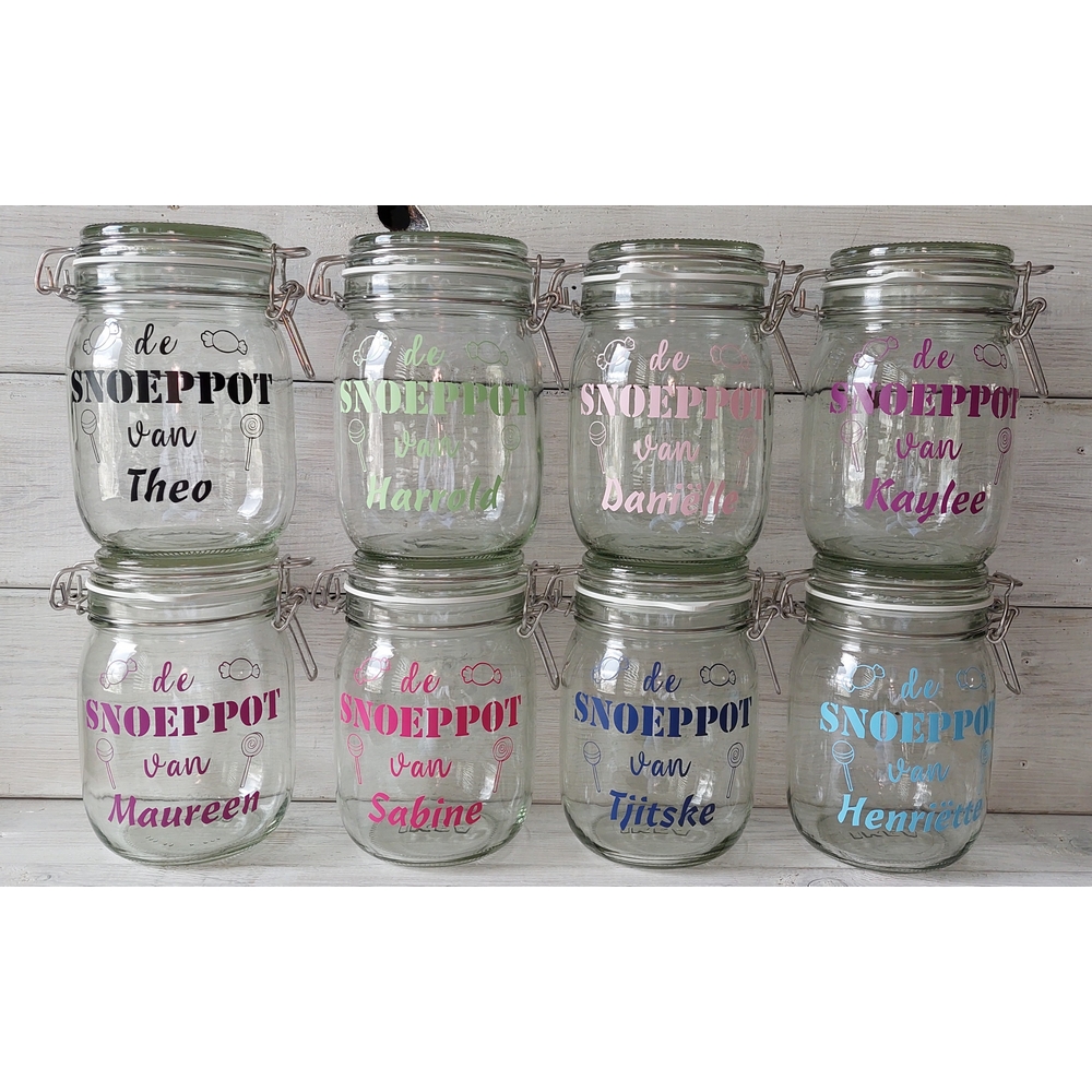 Een weckpot/snoeppot bedrukt met naam! Speciaal gepersonaliseerd voor iemand die helemaal gek is van snoepjes.