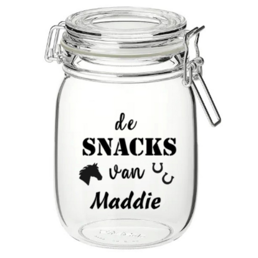 Een weckpot/snoeppot voor de lekkere snacks van het paard. Helemaal speciaal gepersonaliseerd met naam. Handig om de snoepjes, koekjes of andere lekkere snacks van het paard in te bewaren.