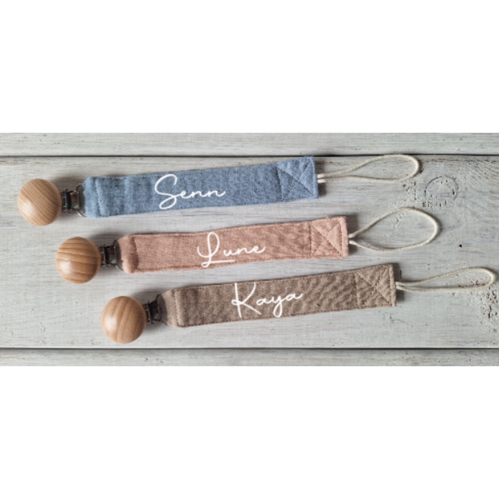 Een gepersonaliseerd speenkoord bedrukt met naam naar keuze.