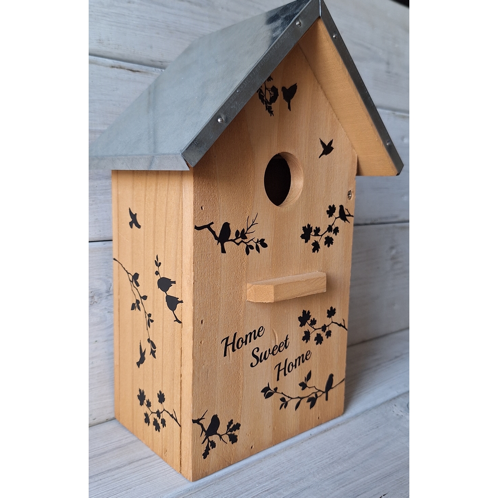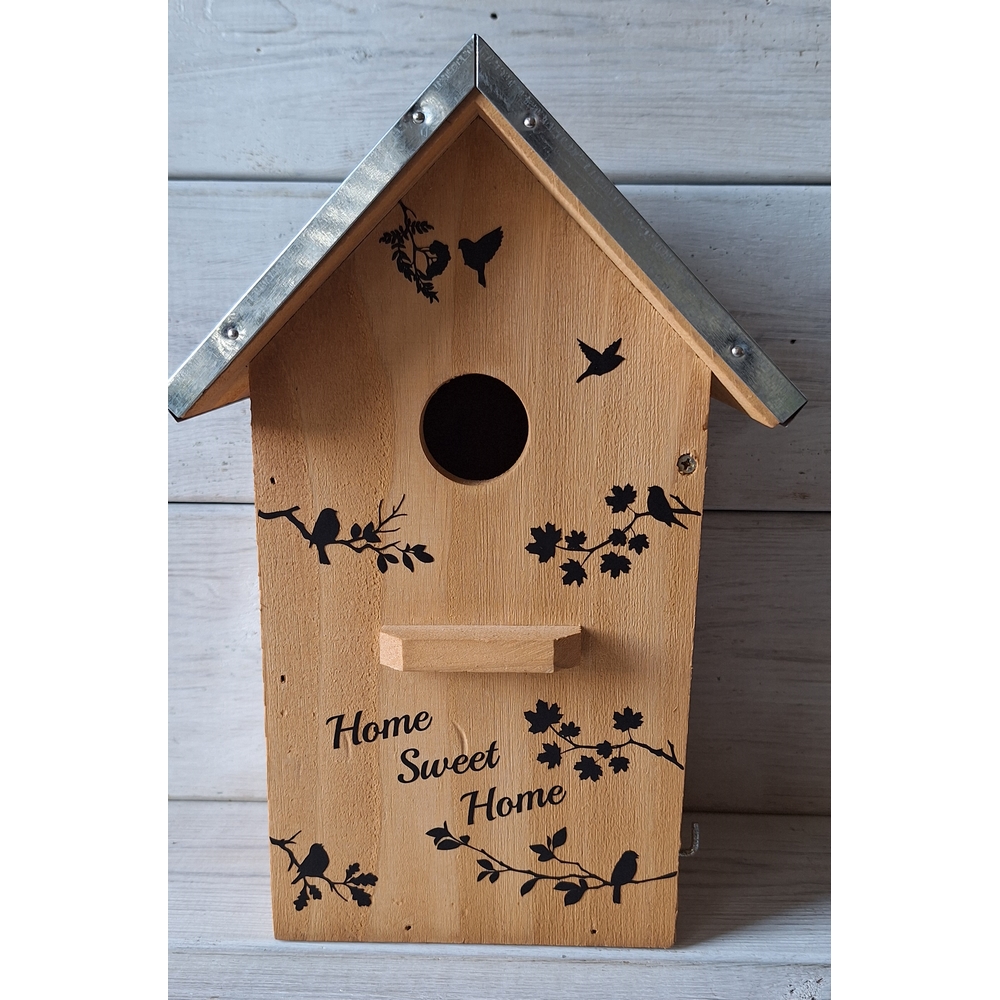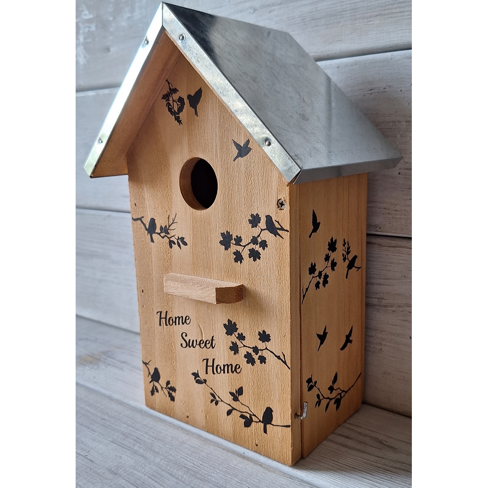 Het nestkastje heeft een metalen dak en een zijkant die open kan.